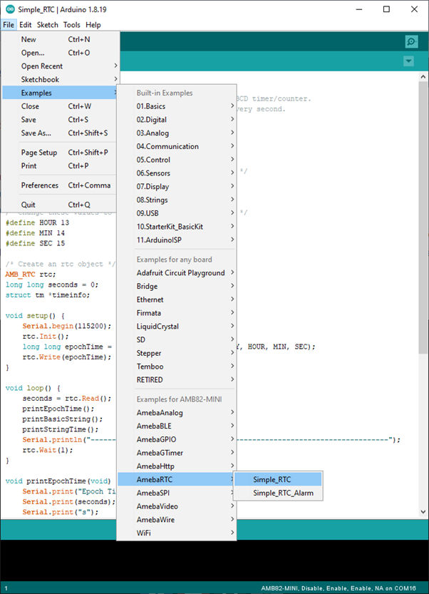 Then open the “RTC” example from File -> Examples -> AmebaRTC -> Simple_RTC