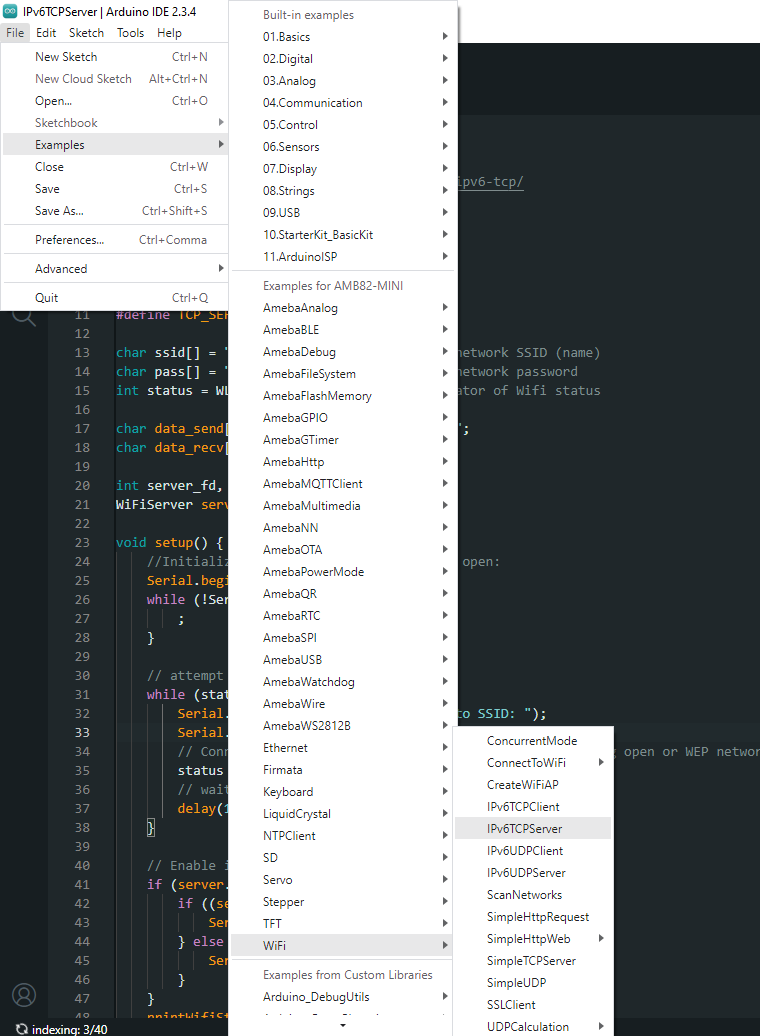 Now take the second AMB82 Mini and open another example, “Files” → “Examples” → “WiFi” → “IPv6TCPClient”.