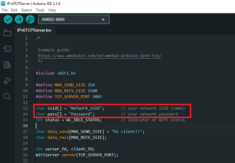 From the previous step, we obtained the server’s IPv6 address. Now, copy this address into the “IPv6TCPClient” example.