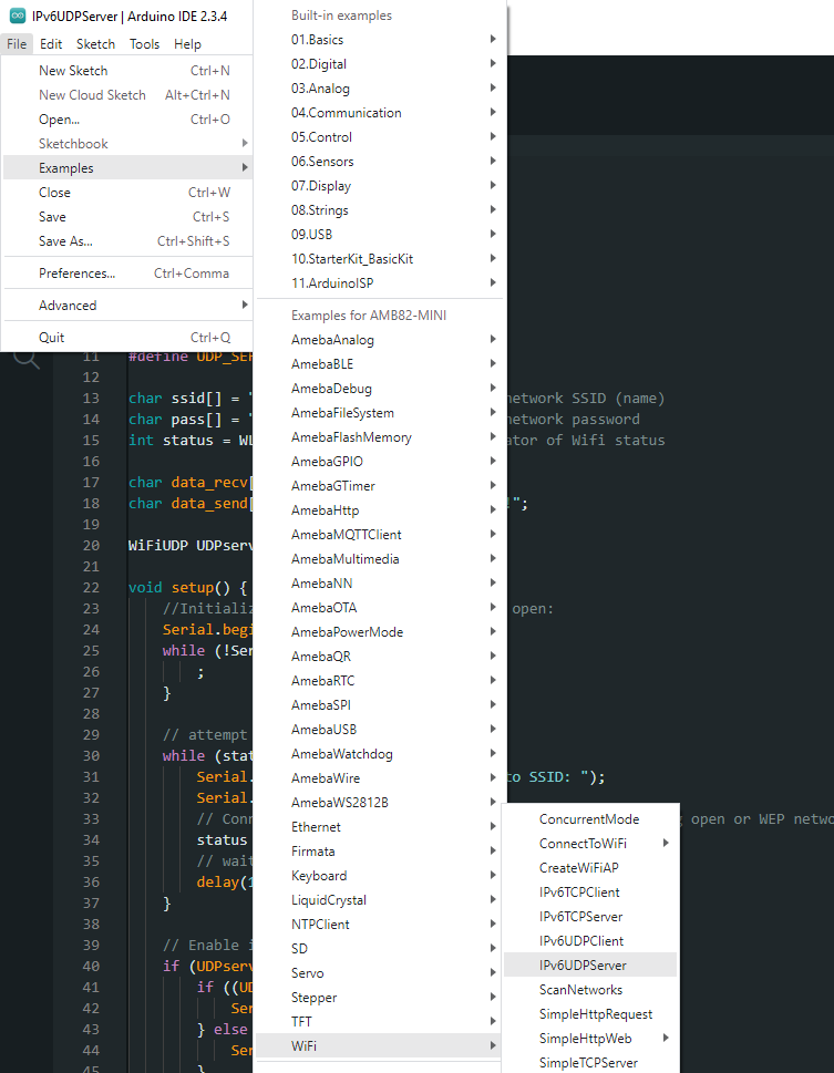 Now take the second AMB82 Mini and open another example, “Files” → “Examples” → “WiFi” → “IPv6UDPClient”.