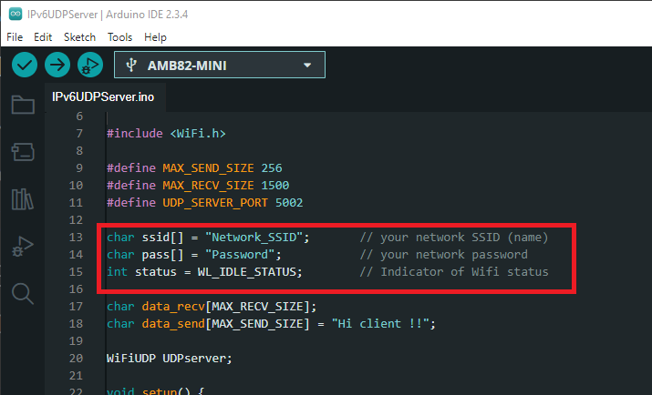 From the previous step, we obtained the server’s IPv6 address. Now, copy this address into the “IPv6UDPClient” example.