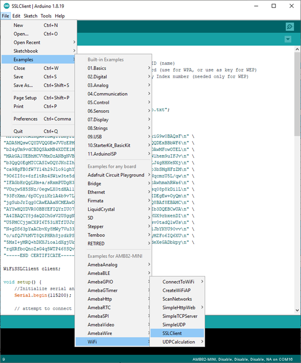 Open the “WiFiSSLClient” example in File -> Examples -> WiFi -> SSLClient