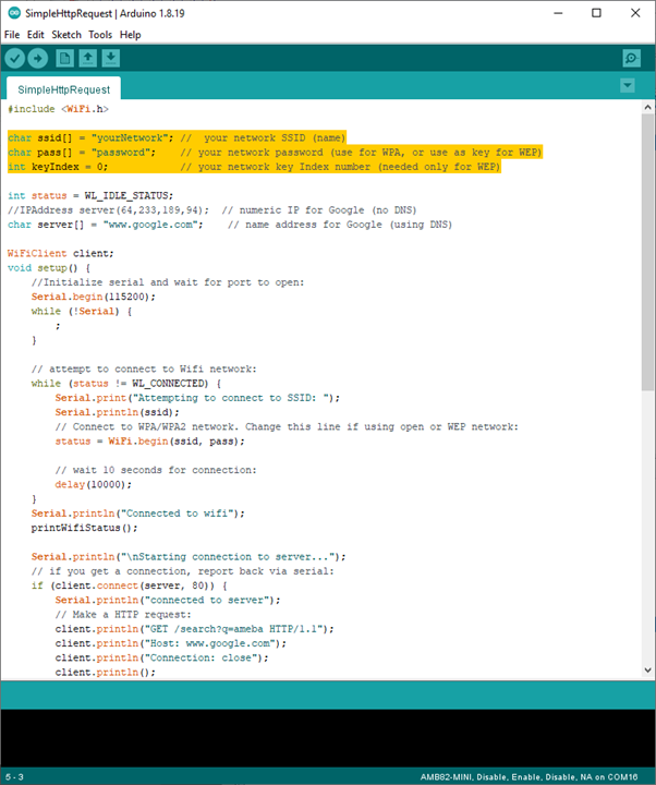 In the sample code, modify the highlighted snippet and enter the required information (ssid, password, key index) required to connect to your WiFi network.