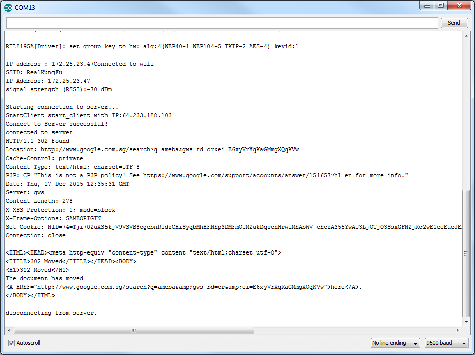 Upload the code and press the reset button on Ameba. Then you can see the information retrieved from Google is shown in the Arduino serial monitor.