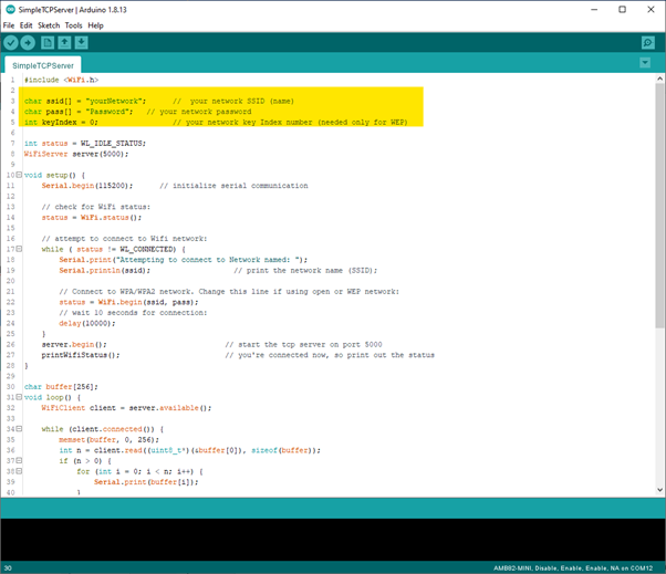 Then, open the Simple WiFi Server example in File -> Examples -> WiFi -> SimpleTCPServer