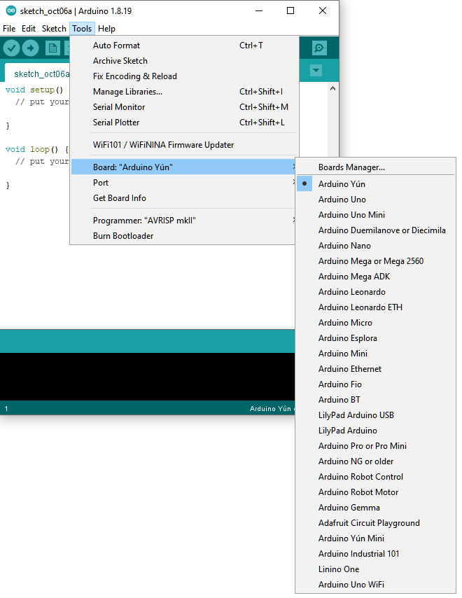 Next, go to “Tools” -> “Board” -> “Boards Manager”: