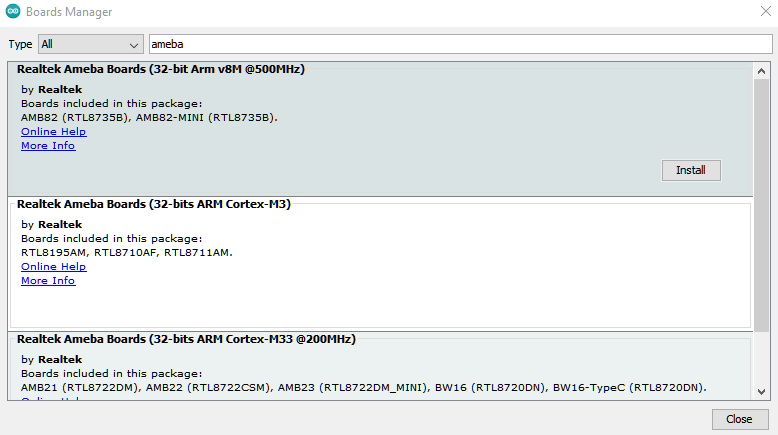 Every time the new hardware is connected, we need to reopen the Board Manager. Find “Realtek Ameba Boards” in the list, click “Install”, then the Arduino IDE starts to download required files.
