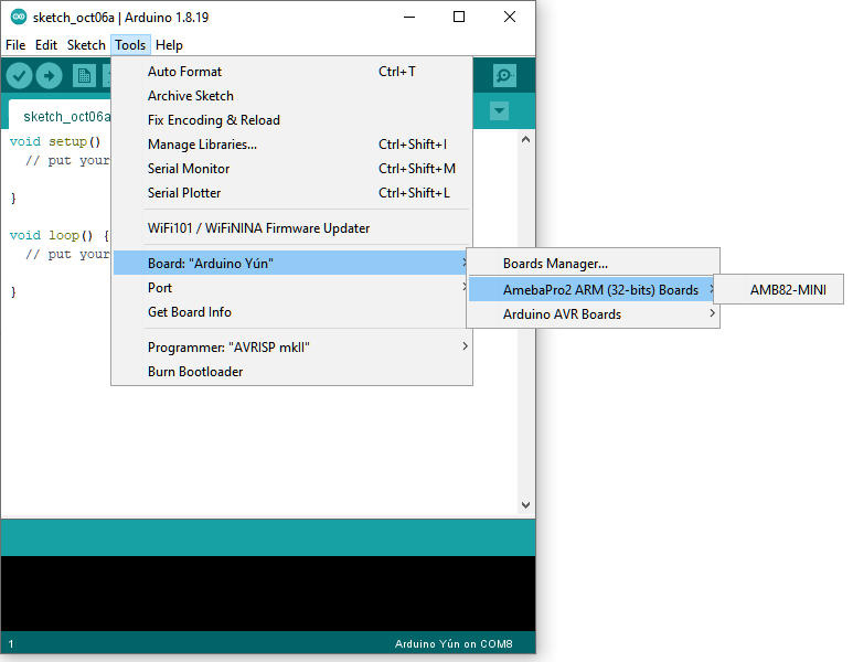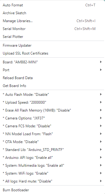 Finally, we select board in “tools” -> “Board” -> “AmebaPro2 ARM (32-bits) Boards” -> “AMB82-MINI”